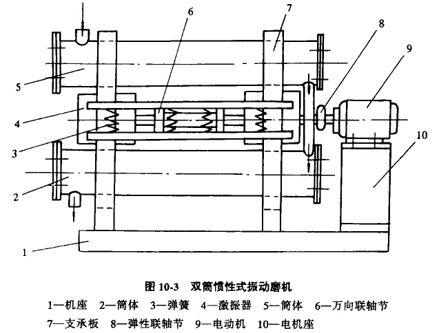 雙筒慣性式振動磨機的構(gòu)造如圖10-3所示。它由機座1,筒體2,5,彈簧3,激振器4,萬向聯(lián)軸節(jié)6,支承板7,彈性聯(lián)軸節(jié)8和電動機9等組成。雙筒振動磨機的粉磨筒體為串聯(lián)方式上下布置,它們之間通過文承板7互連在一起,而支承板由彈簧3支承在機座I上。在支承板中部裝有激振器,激振器主動上裝有可調(diào)式偏心塊,激振器主鈾通過彈性聯(lián)軸節(jié)與電動機相連接。當(dāng)電機通過彈性聯(lián)軸節(jié)帶動主軸轉(zhuǎn)動時,偏心塊產(chǎn)生離心力使筒體產(chǎn)生振動,物料從上筒體5的—端給入,在筒內(nèi)受到粉磨介質(zhì)的激烈振動沖擊磨剝作用粒度變小,并運動了筒體另一端,從排料門給入到筒體2進行粉磨,粉磨達到產(chǎn)品粒度要求p則從下筒體的誹料口排出。當(dāng)產(chǎn)品粒度要求較粗時,也可采用兩個筒體并列布置的方式,被磨物料僅通過一個粉磨筒體,則可獲得兩倍的臺時產(chǎn)量。