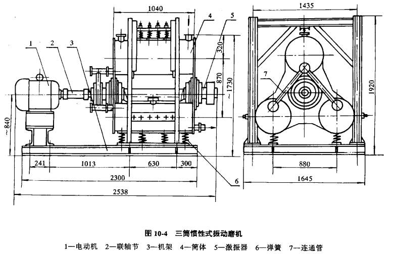 三筒慣性式振動磨機的構(gòu)造如圖10-4所示。它由電機1、聯(lián)軸節(jié)2、機架3、筒體4、激振器5、彈簧6相連通管7等部分組成。振動磨機的筒體由三個圓筒和兩塊側(cè)板構(gòu)成,通過兩側(cè)板將較大的上圓筒φ400xl040和較小的兩個下圓筒φ320xl040串聯(lián)在一起,而兩個下圓筒彼此互成并聯(lián),各圓筒內(nèi)壁上均鈕有襯板,以防筒壁磨損。激振器主要由偏心軸、可調(diào)式偏心塊、鑄鋼軸承座、雙列調(diào)心滾子軸承和迷宮式密封環(huán)等組成。電機1通過彈性聯(lián)軸節(jié)2帶動激振器5的偏心軸及安裝在軸兩側(cè)的偏心塊旋轉(zhuǎn),產(chǎn)生離心力,從而使坐落在彈簧上的筒體產(chǎn)生高頻小幅振動。物料和水不斷地從上圓筒的給料口加入,物料在筒內(nèi)粉磨介質(zhì)的頻繁沖擊和研磨作用下被磨細(xì),完成一段粉磨,而后經(jīng)過排料連通管分別流入下部兩個小圓筒內(nèi)進行第二段粉磨,粉磨好的合格產(chǎn)品從小圓筒的排料口排出。整個粉磨作業(yè)為連續(xù)作業(yè)。